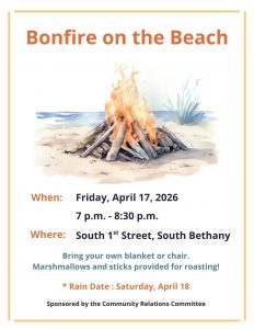 Bring a blanket or a chair, and we will provide marshmallows and sticks for roasting. In the event of rain, the event will be moved to the following night (Saturday, April 18, 7 p.m.).